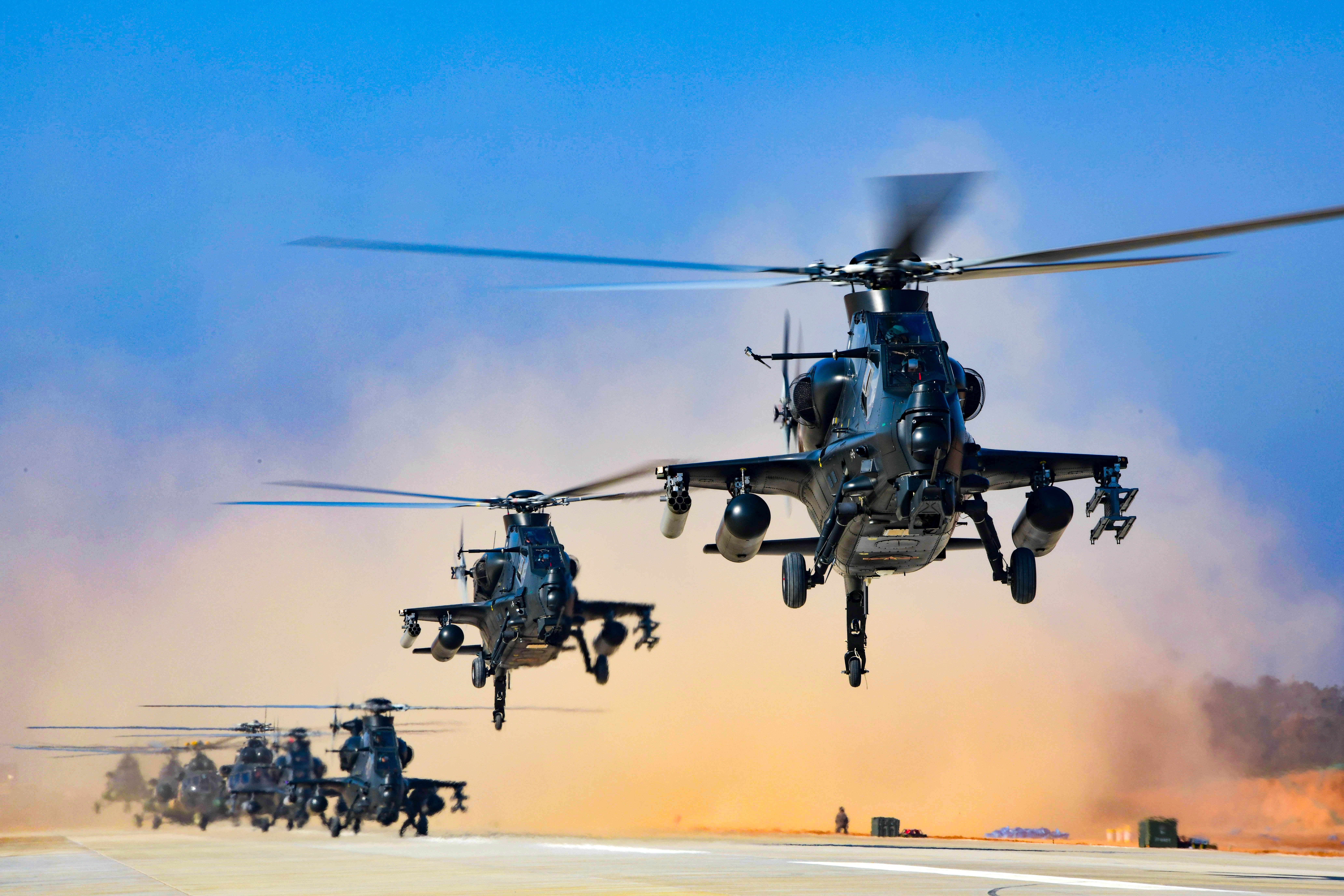 陸軍第73集團軍某陸航旅組織飛行訓練,戰(zhàn)機編隊依次起飛(2021年4月22日攝)。新華社發(fā)(李士龍 攝)