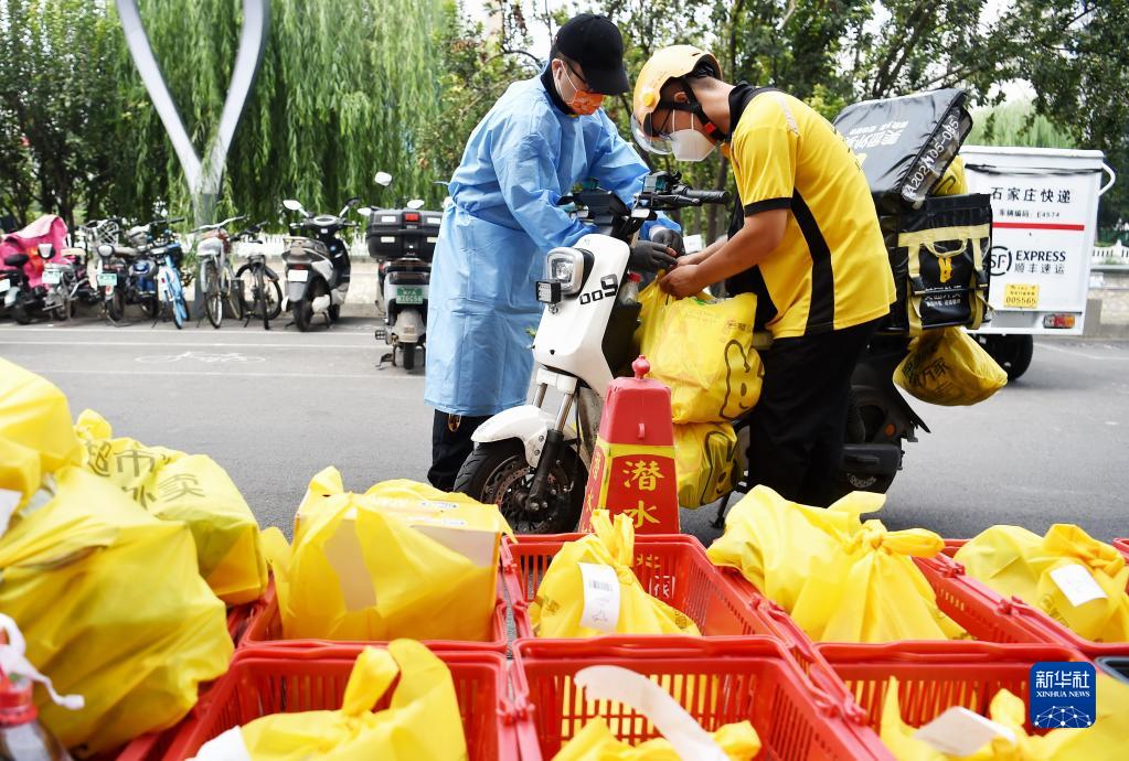 在河北省石家莊市裕華區(qū)一家超市保供點,外賣人員在打包,準(zhǔn)備為市民送貨(2022年8月30日攝)。新華社記者 楊世堯 攝