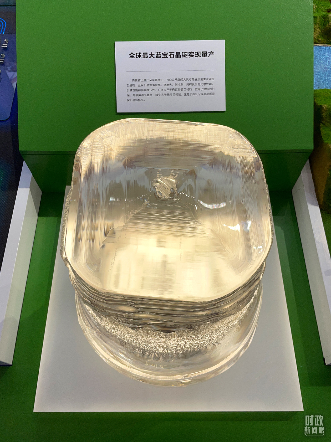 △ 這是350公斤級(jí)高品質(zhì)藍(lán)寶石晶錠樣品。藍(lán)寶石晶體強(qiáng)度高、硬度大、耐沖刷,應(yīng)用于精尖光學(xué)元件等領(lǐng)域。(總臺(tái)央視記者彭漢明拍攝)