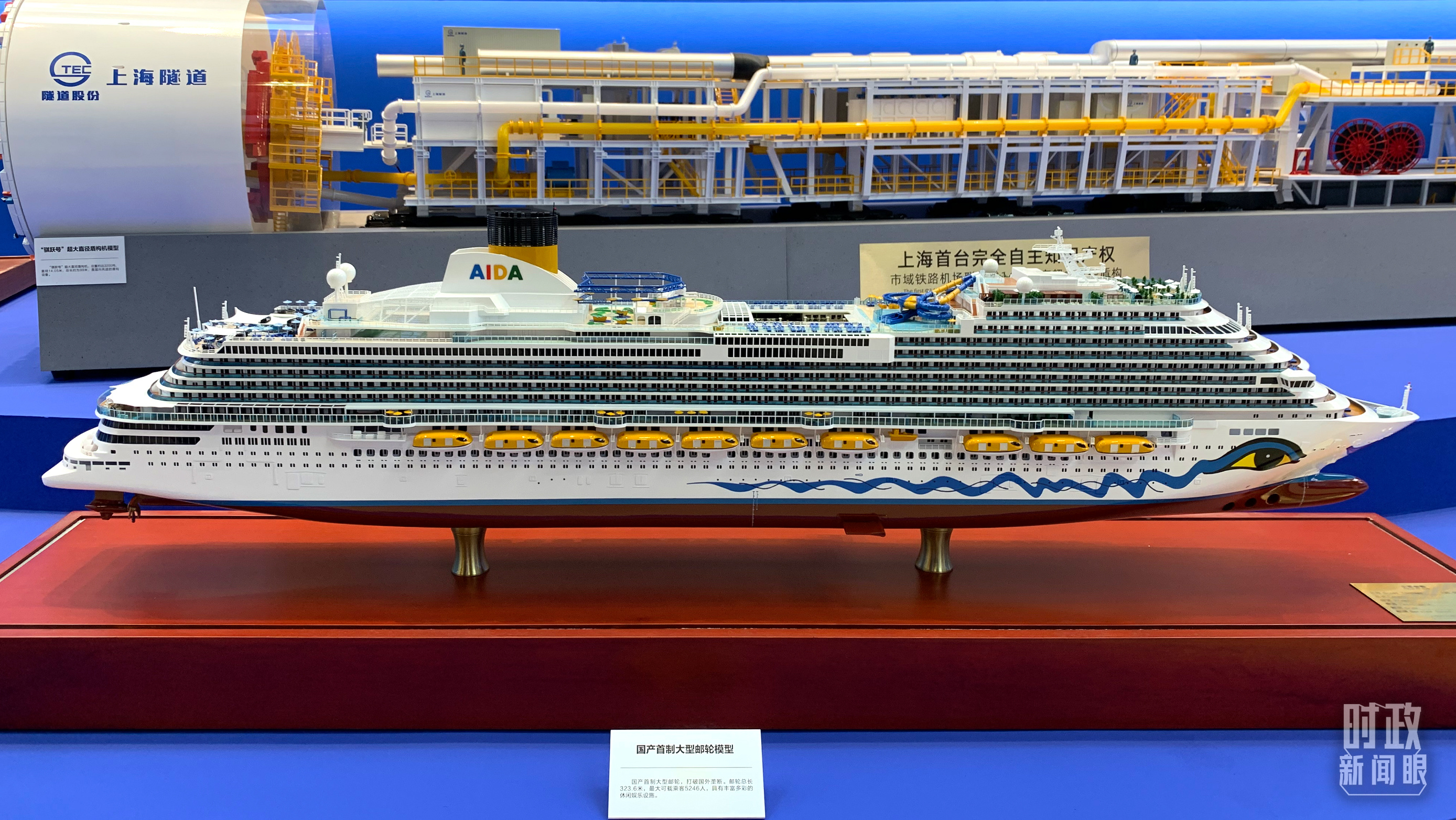 △ 國(guó)產(chǎn)首制大型郵輪模型。郵輪總長(zhǎng)323.6米,最大可載乘客5246人。(總臺(tái)央視記者韓銳拍攝)