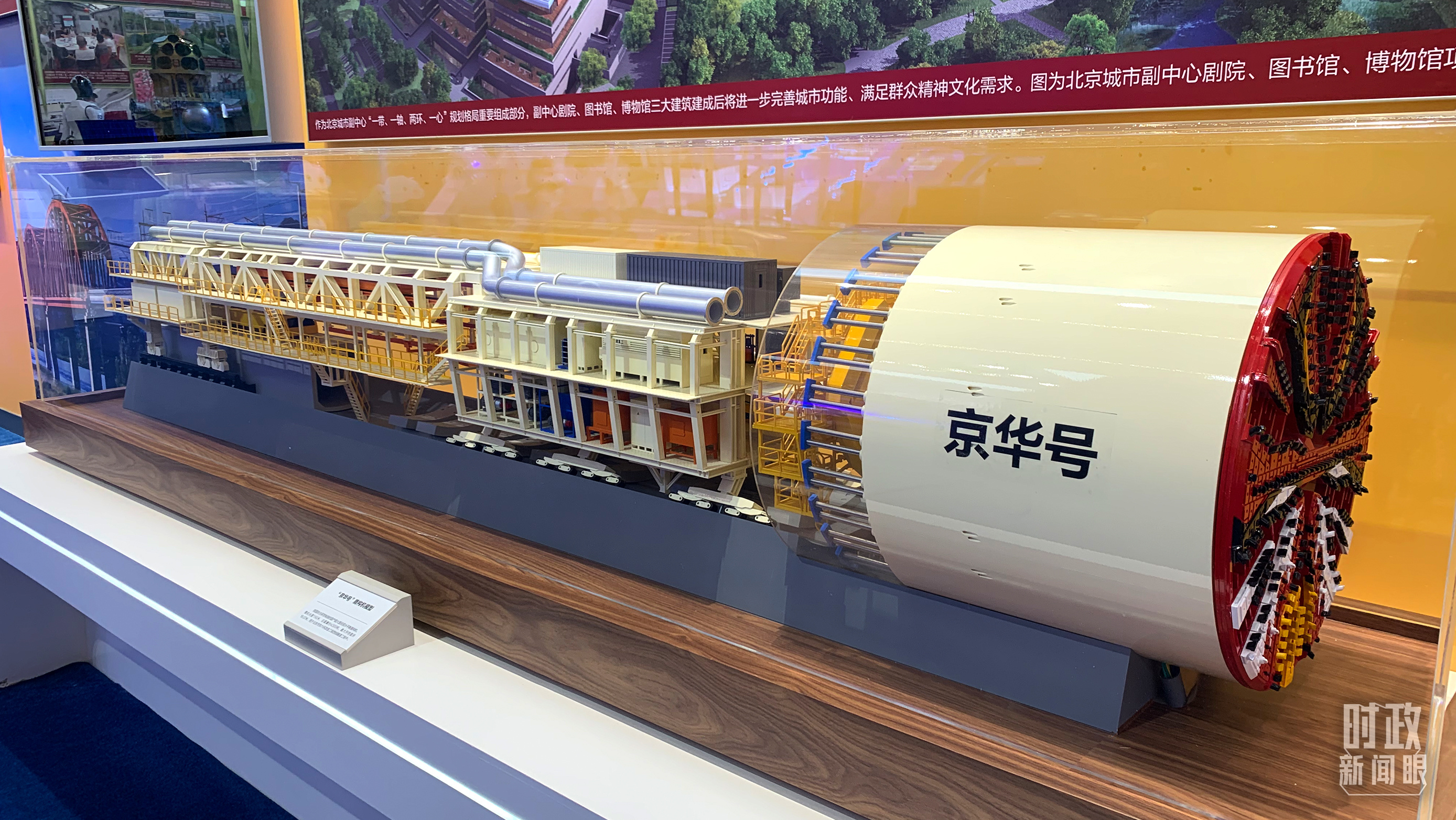 △“京華號(hào)”盾構(gòu)機(jī)模型。整機(jī)長(zhǎng)度150米,用于北京市東六環(huán)改造工程西線隧道工程中。(總臺(tái)央視記者許永松拍攝)