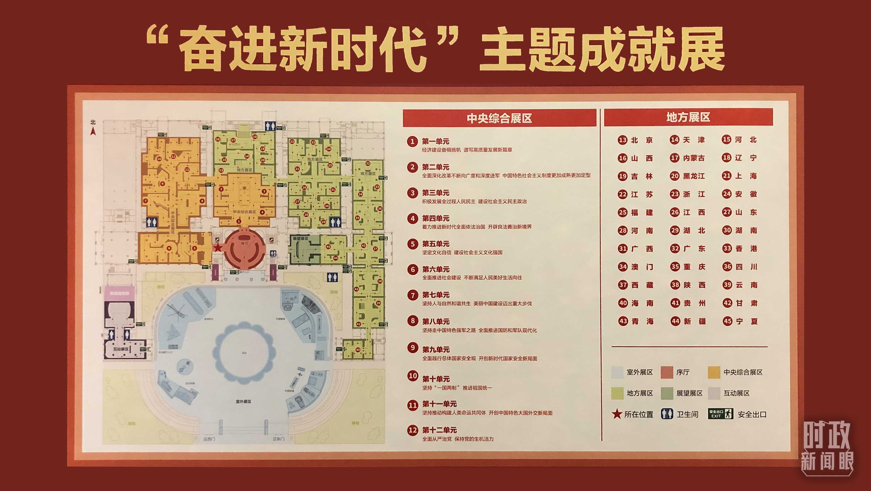 “奮進(jìn)新時(shí)代”主題成就展設(shè)序廳、中央綜合展區(qū)、地方展區(qū)、展望展區(qū)、室外展區(qū)和互動(dòng)展區(qū)6個(gè)展區(qū),面積超過(guò)3萬(wàn)平方米,運(yùn)用圖片、實(shí)物、模型等6000多項(xiàng)展覽要素。