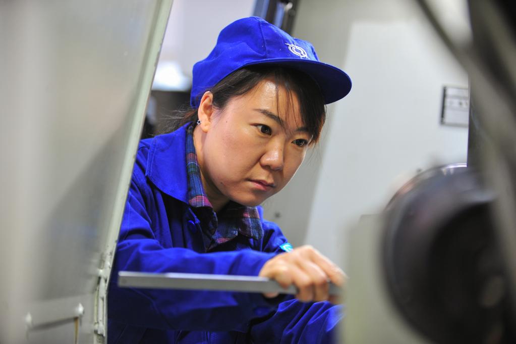 在中國兵器內(nèi)蒙古第一機械集團有限公司第四分公司,趙晶為數(shù)控機床更換精加工所用的刀片(2018年3月5日攝)。新華社記者 彭源 攝