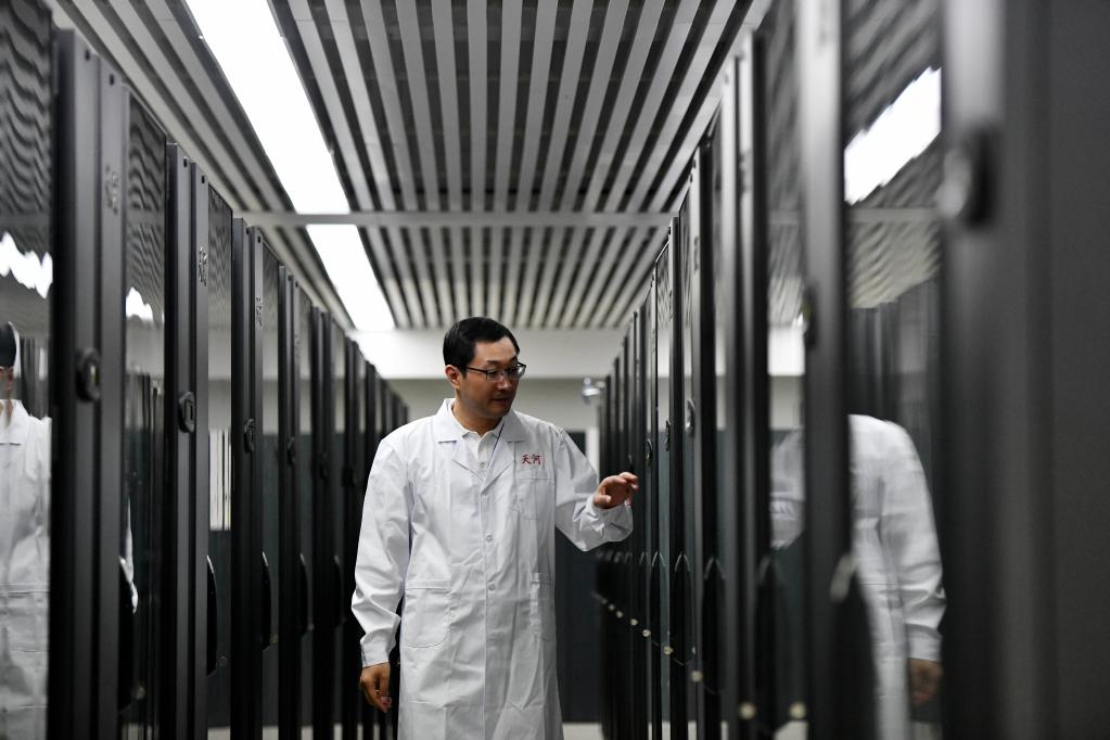在國家超級計算天津中心“天河一號”機房內(nèi),孟祥飛在查看設(shè)備運行狀態(tài)(2021年5月27日攝)。新華社記者 趙子碩 攝