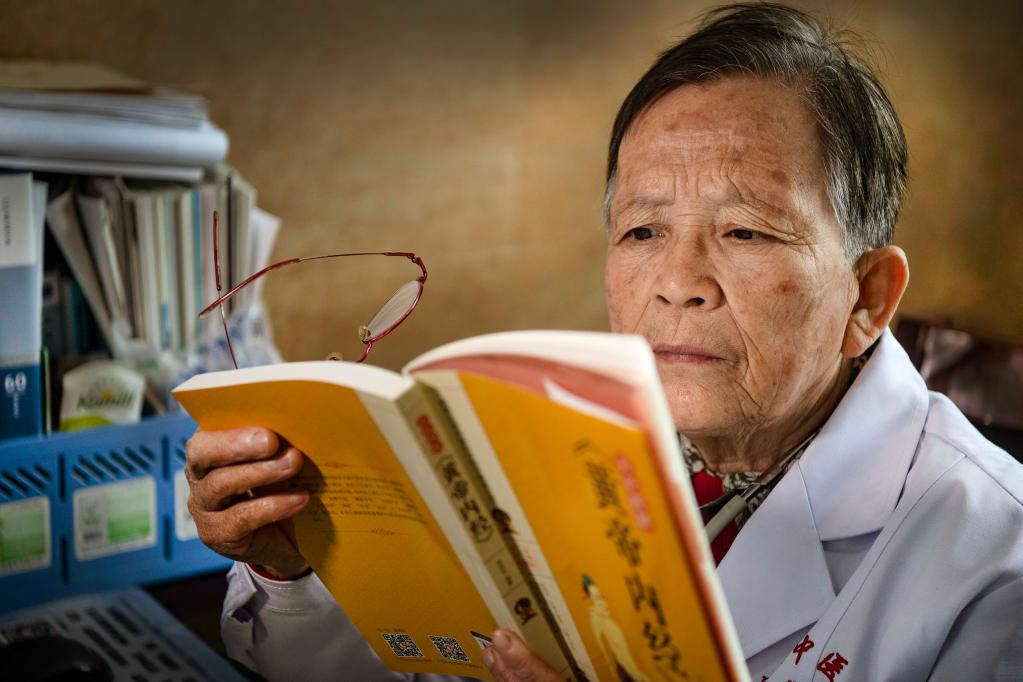 在陜西佳縣中醫(yī)院門診義診的路生梅,沒有病人時堅持看書學習(2020年4月8日攝)。新華社記者 陶明 攝