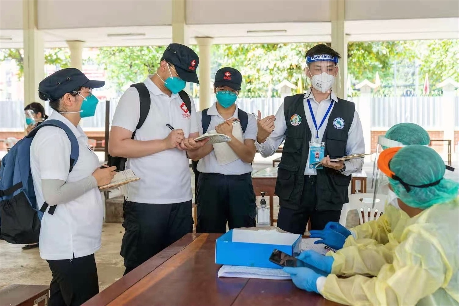 2021年5月7日,中國政府醫(yī)療專家組在老撾首都萬象考察一個新冠病毒采樣點,了解采樣流程、信息采集、密切接觸者判定標(biāo)準(zhǔn)和環(huán)境消毒等情況。新華社發(fā)(中國政府醫(yī)療專家組供圖)