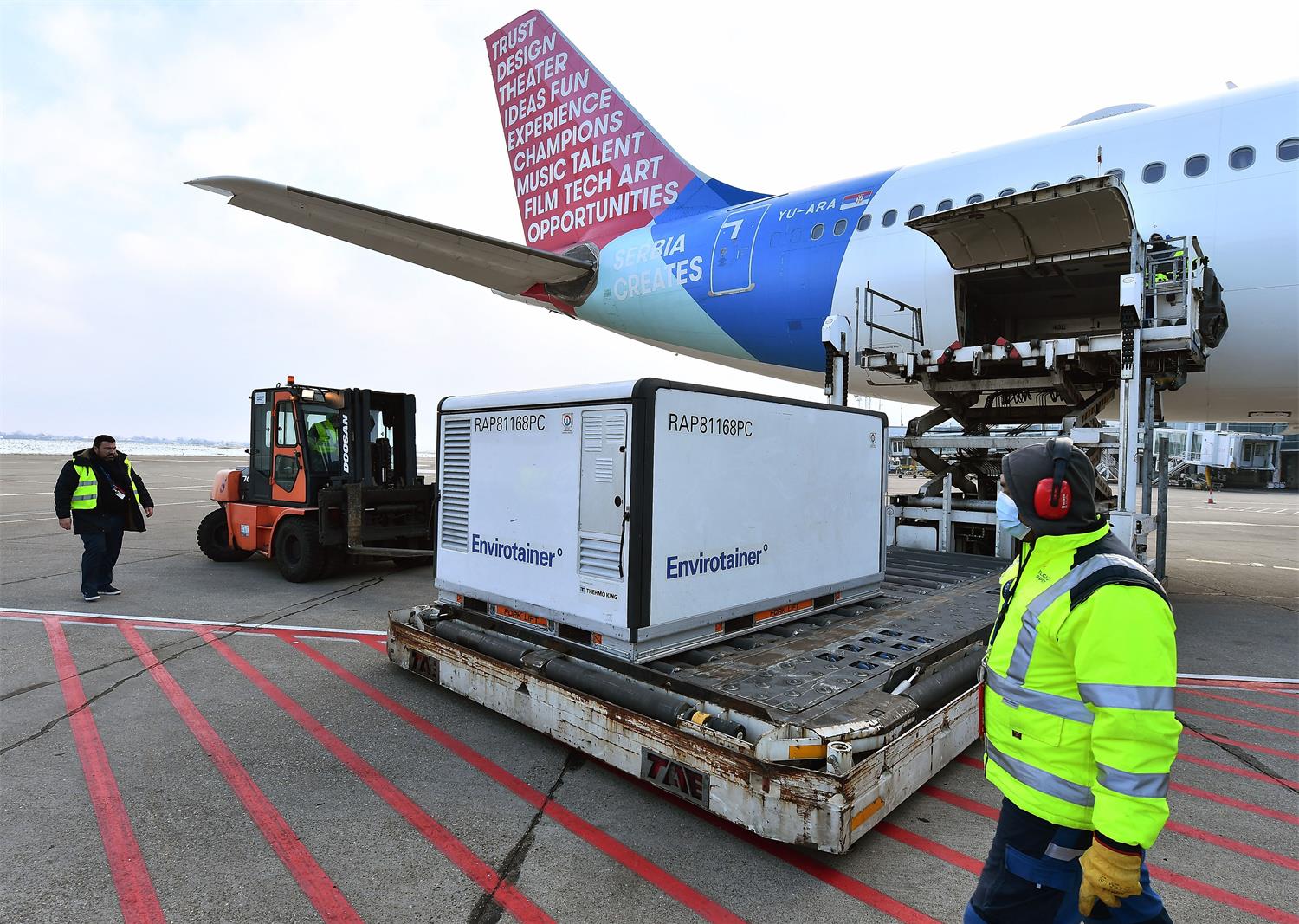 2021年1月16日,在塞爾維亞首都貝爾格萊德,機(jī)場工作人員卸載由中國國藥集團(tuán)生產(chǎn)的新冠疫苗。新華社發(fā)(普雷德拉格·米洛薩夫列維奇攝)