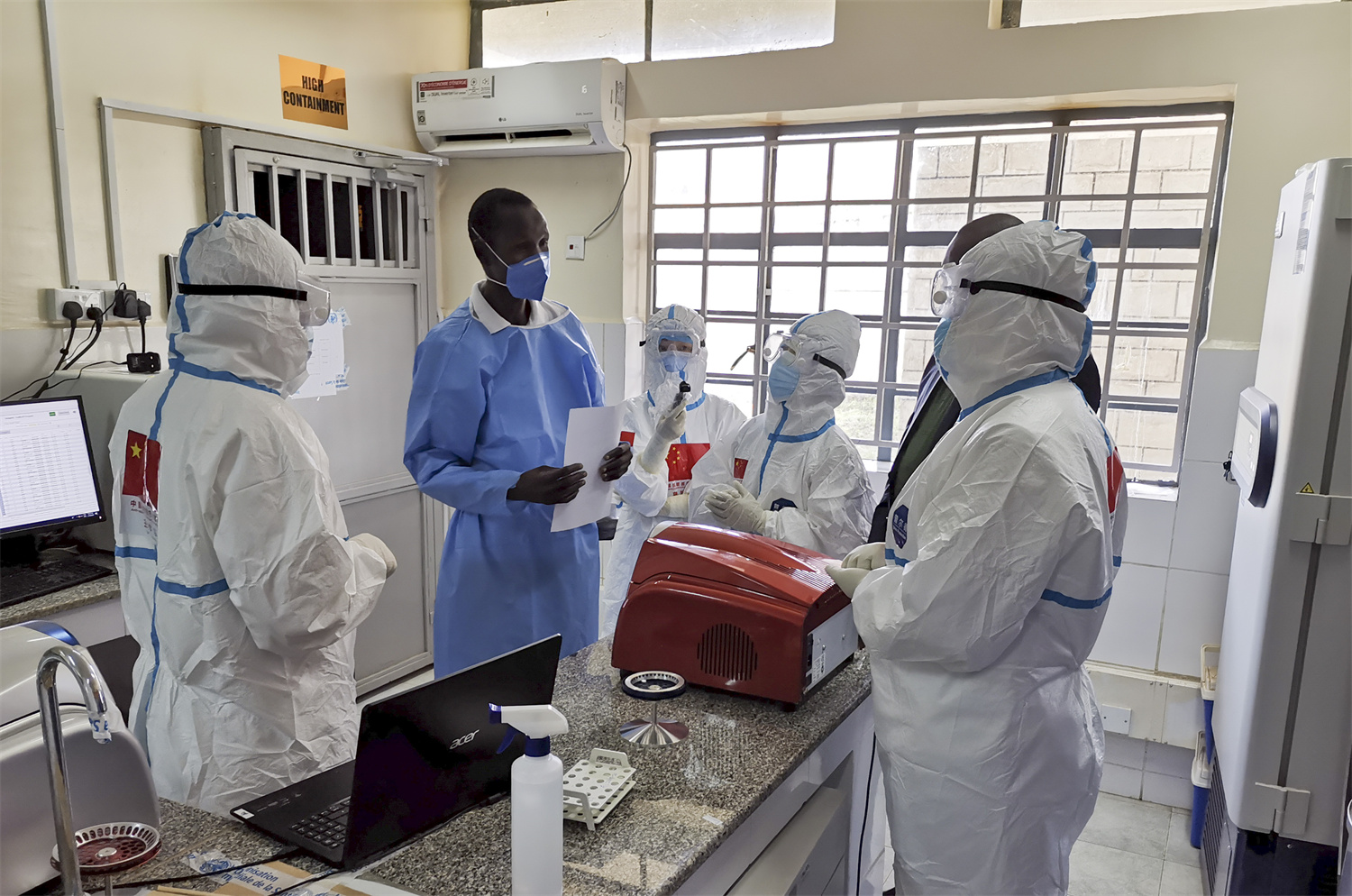 2020年8月21日,在南蘇丹首都朱巴的一處新冠病毒檢測機(jī)構(gòu),中國抗疫醫(yī)療專家組成員與當(dāng)?shù)蒯t(yī)護(hù)人員交流。新華社發(fā)(中國駐南蘇丹大使館供圖)