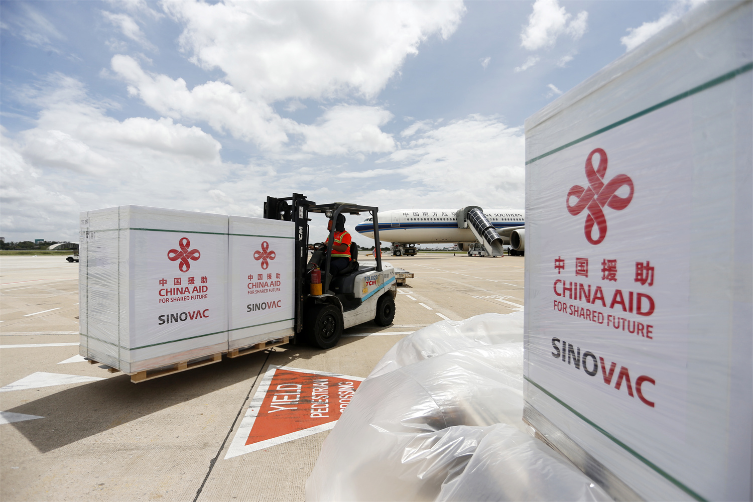 2021年10月14日,工作人員在柬埔寨金邊國際機(jī)場運輸中國政府援助柬埔寨的科興新冠疫苗。新華社發(fā)(批隆攝)