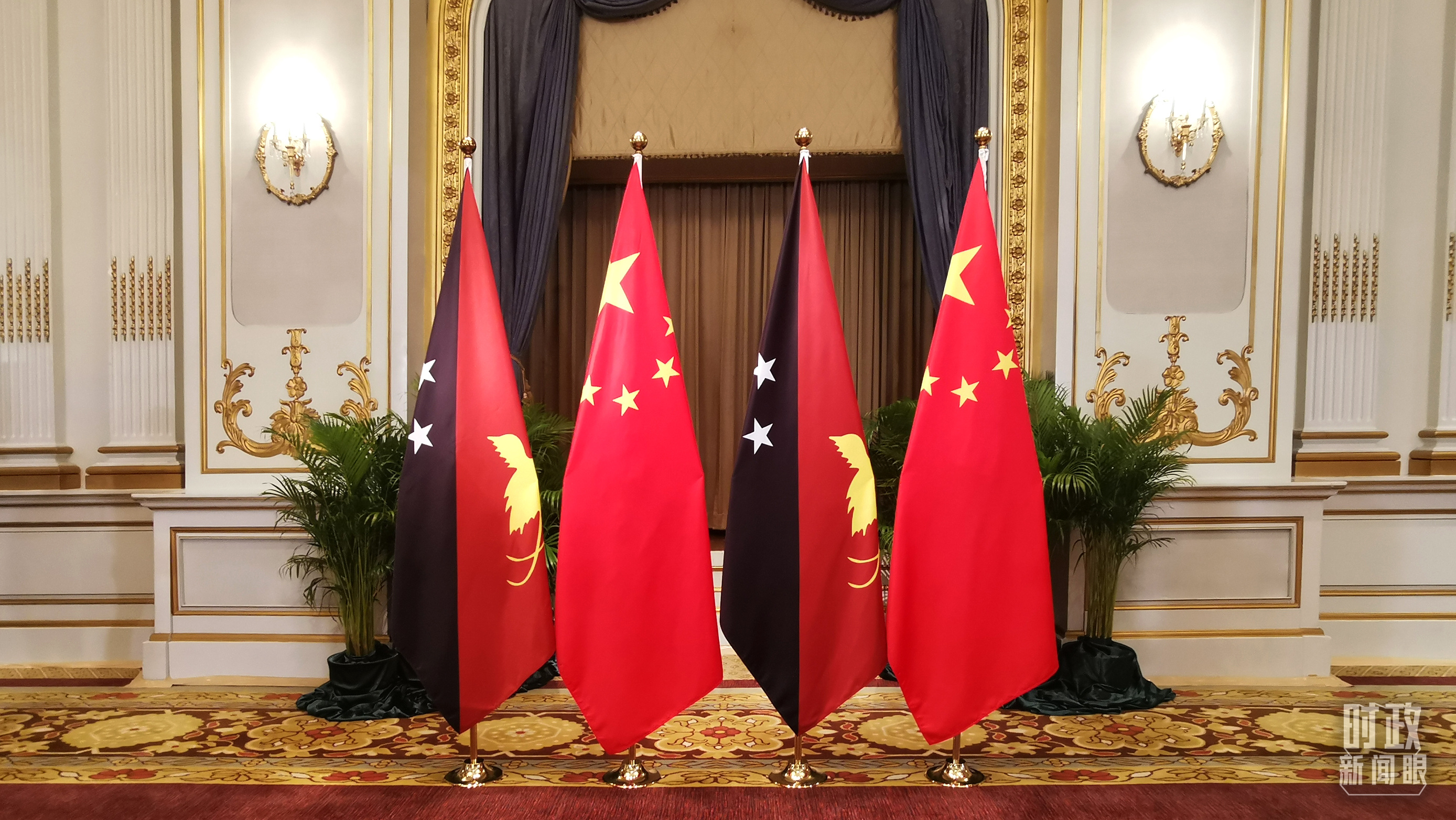 △會見現(xiàn)場的中國與巴新兩國國旗。(總臺央廣記者劉會民拍攝)