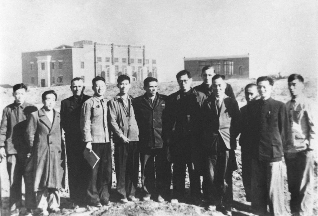 1956年,江澤民同志(左七)在長春第一汽車制造廠同援建一汽的蘇聯(lián)專家等合影。新華社發(fā)