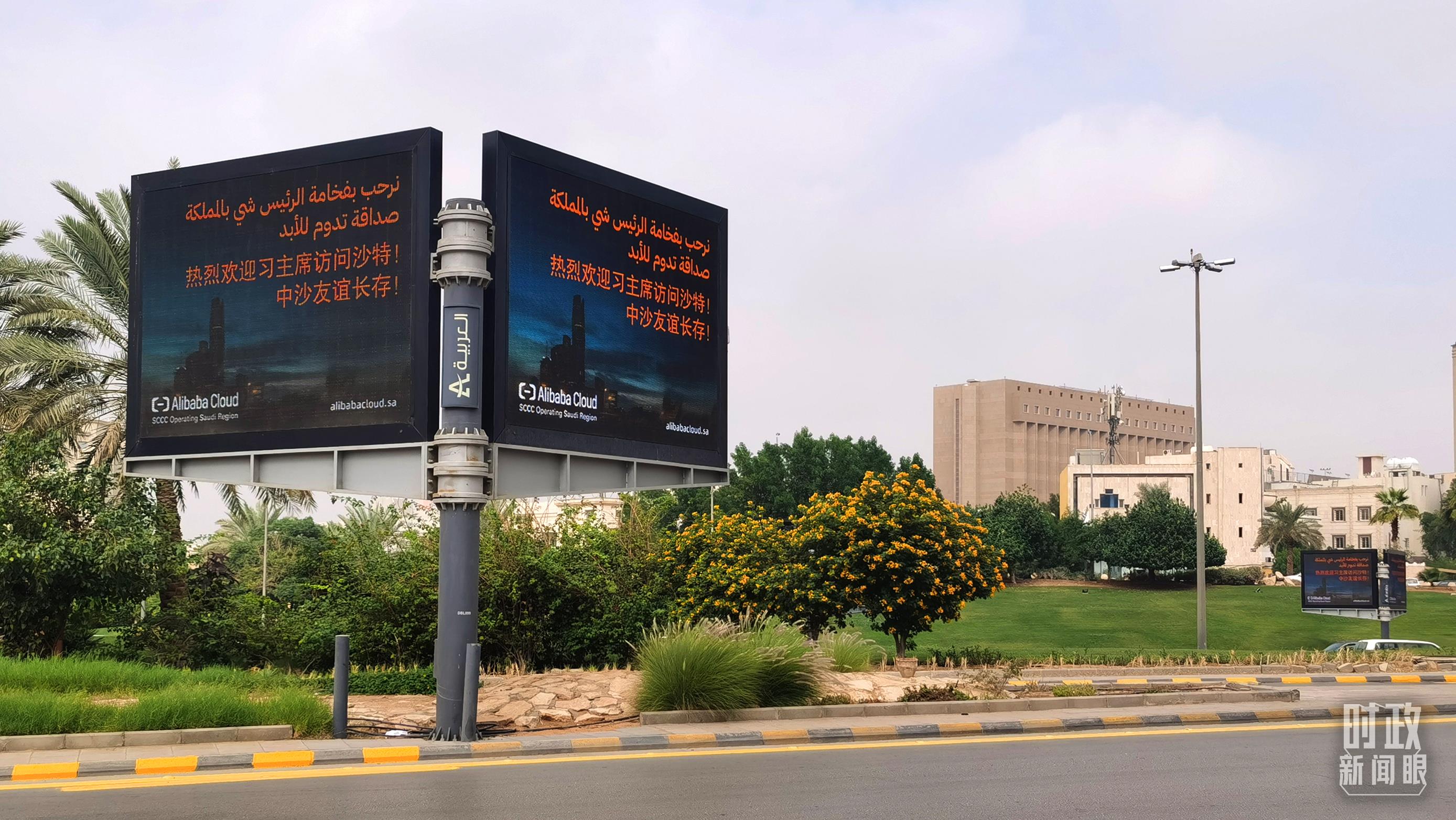 △利雅得,電子屏幕用中文顯示“熱烈歡迎習主席訪問沙特”。(總臺央視記者曹亞星拍攝)