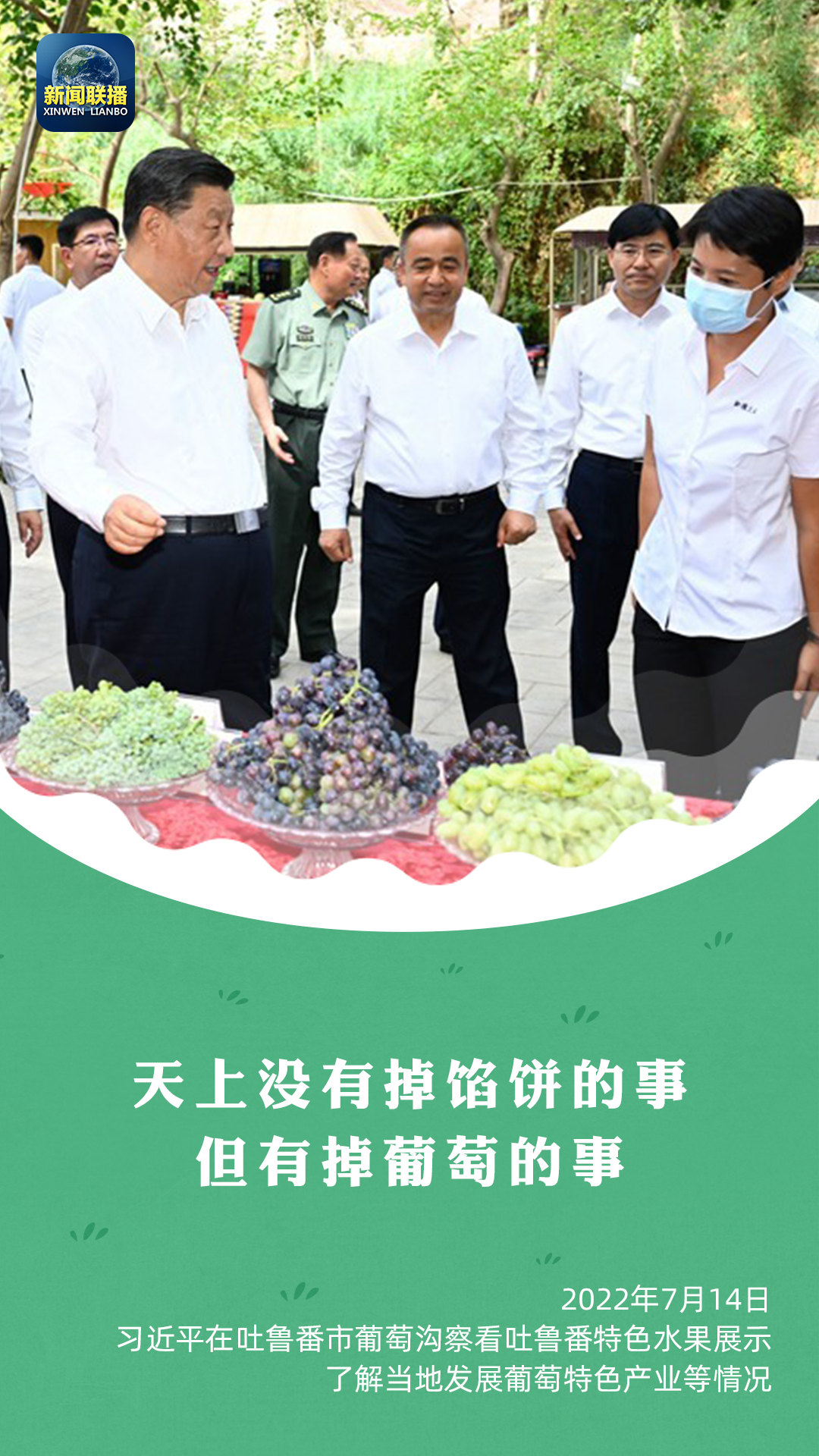 “多么富饒的一個地方,瓜果飄香。這是大自然的饋贈。”總書記風趣地說,“天上沒有掉餡餅的事,但有掉葡萄的事。”總書記還強調,要推動文化和旅游融合發(fā)展,打造富民產(chǎn)業(yè)。