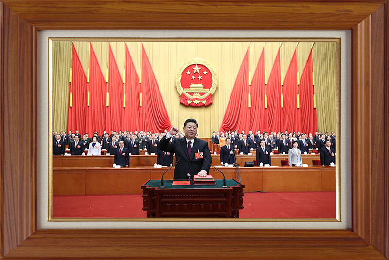 這張照片,是2018年3月17日,習(xí)近平當(dāng)選國(guó)家主席、中央軍委主席后進(jìn)行憲法宣誓的場(chǎng)景。自發(fā)表2019年新年賀詞起,就一直擺在書架上。