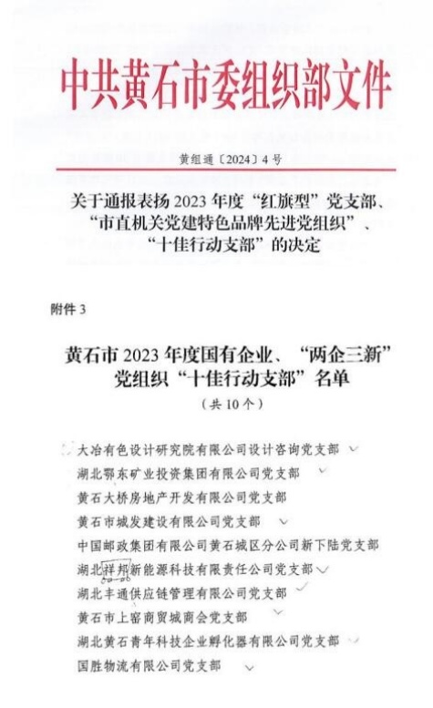 【喜報】喜訊!城發(fā)建工集團(tuán)城發(fā)建設(shè)公司黨支部獲評2023年度黃石市國有企業(yè) “十佳行動支部”